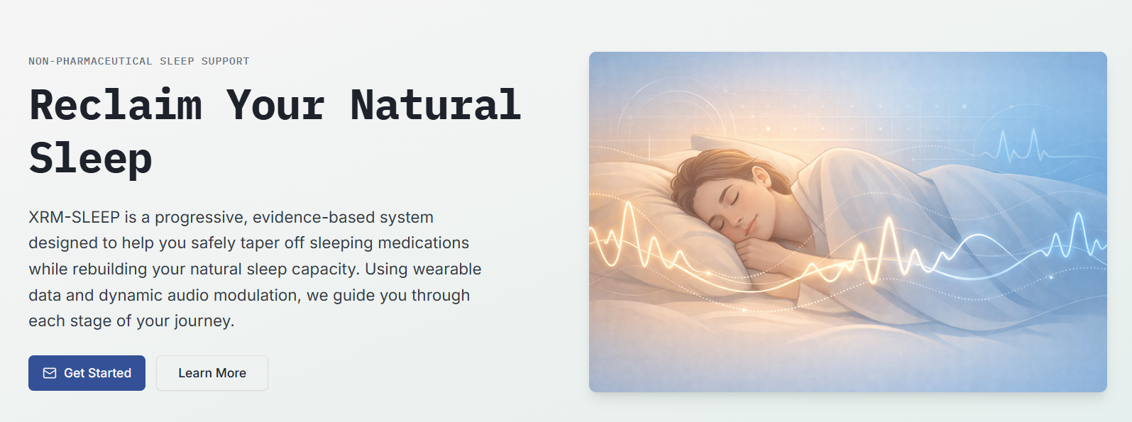 XRM-SLEEP is a progressive, evidence-based system designed to help you safely taper off sleeping medications while rebuilding your natural sleep capacity. Using wearable data and dynamic audio modulation, we guide you through each stage of your journey.